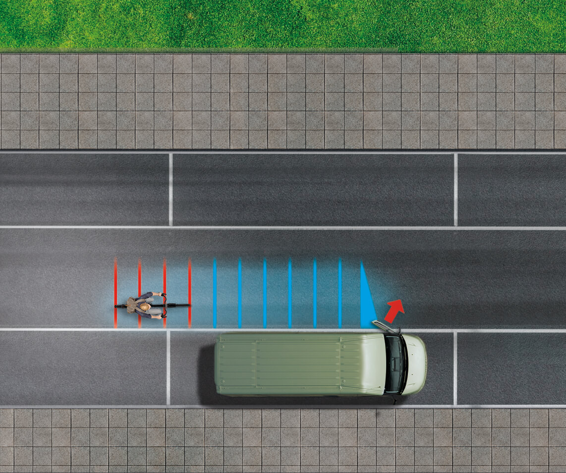 Njohin një përplasje të mundshme përpara, paralajmërojnë drejtuesin dhe ngadalësojnë automjetin sa më shumë që të jetë e mundur. Garanton frenim të plotë nga 80 në 0 km/h.