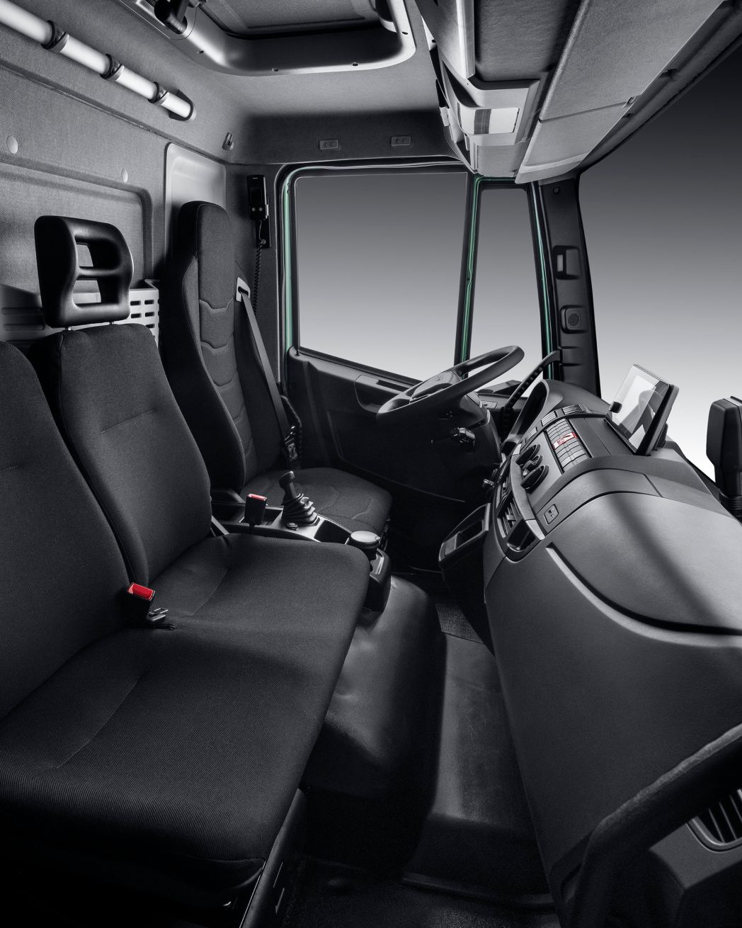 Komoditeti i shoferit garantohet nga sedilje me mbështetëse të plotë dhe pëlhurë të salduar elektro. Ka në dispozicion opsionale sedilje pneumatike "high-comfort", me rregullim të gjerë të mbështetëses së shpinës, rrip sigurimi me lartësi të ndryshueshme, sfungjer me densitet të dyfishtë dhe ngrohje/ajrosje. Mbështetëset e krahëve janë opsion për të gjitha sediljet pneumatike.