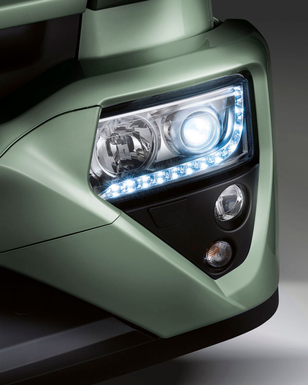 Faqja e kabines eshte dizenjuar duke patur ne mendje qytetin. Xhami i perparme me filter mbrojtes nga dielli te integruar ne te, siguron nje hijezim te shkelqyer, duke menjanuar keshtu impaktin qe do kishin grilat e jashtme per mbrojtjen nga dielli ne konsumin e karburantit. Parakolpi integron ne te shkallaret e kabines, radaret e ADAS dhe AEBS (Sistemi i Perparuar i Frenimit te Menjehershem). Feneret me Dritat e Drejtimit gjate Dites (DRL) LED (standart), gjithashtu te vlefshem me llampa Xenon.