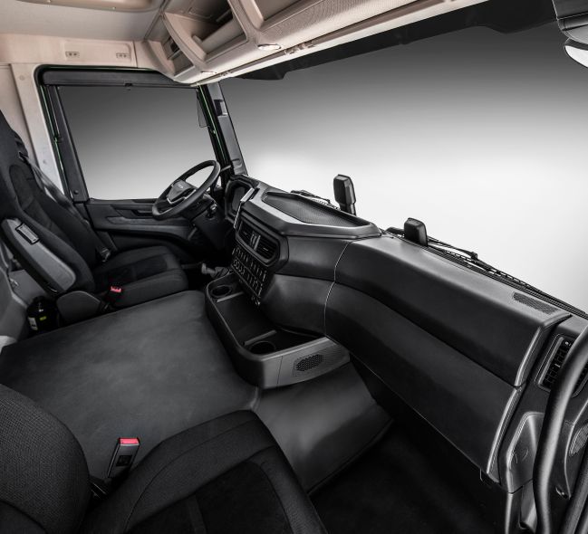 Komoditeti i jashtëzakonshëm në kabinë arrihet falë timonit të ri, grupit të ri të plotë të instrumenteve TFT dhe sistemit të infotainment-it, kamerave pa pasqyra dhe frenës elektrike të parkimit. Me diametrin e timonit të reduktuar në 450 mm, sigurohet ndjesia “si në makinë”. Mbajtëset për gota dhe shishe janë të vendosura në mënyrë të përshtatshme.